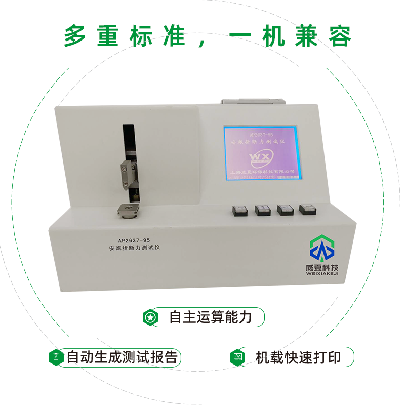 威夏科技 AP2637-95 安瓿折斷力測試儀是國家檢驗生產(chǎn)廠家產(chǎn)品性能的高效檢測設備。設備應用:安瓿折斷力測試儀主要用于測定安瓿瓶折斷力的物理特性,是鑒定安瓿瓶的重要手段之一。菜單選擇規(guī)格、標準支架、上行、下行、時間、標定、測試次數(shù)、實時顯示折斷力及折斷力曲線,并可有機載打印機打印。
